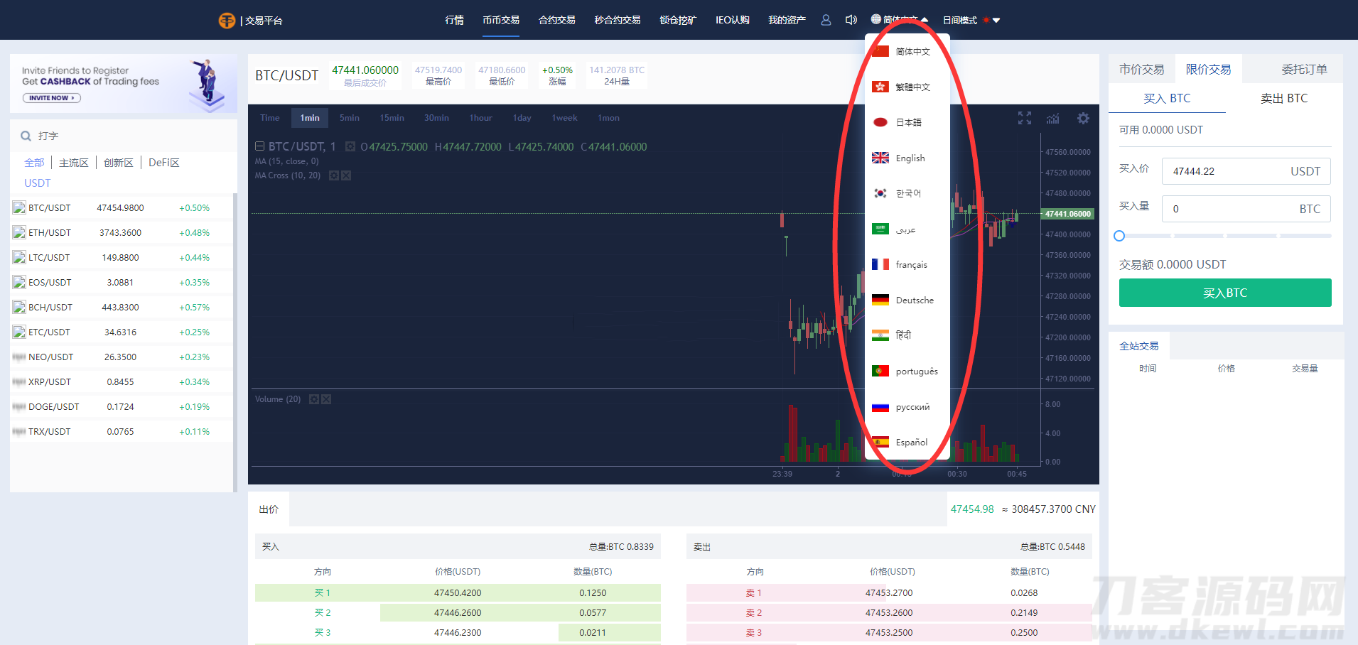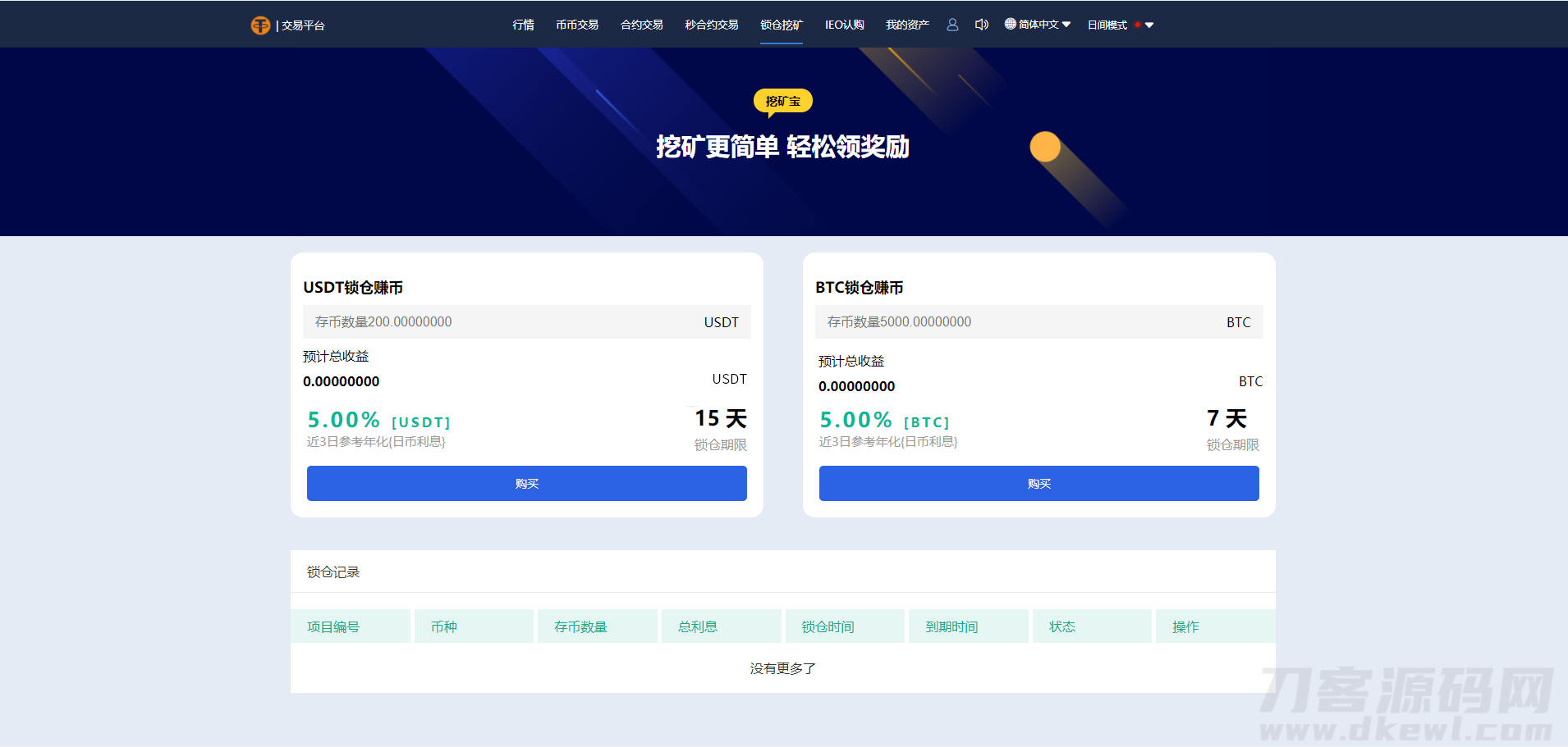 简介:多语言交易所,12国语言,秒合约,申购,锁仓,K线完整,脚本最全,带教程,日夜模式。 服务器打包,功能就不多说了该有的都有。图片素材失效可以自己在源码包里补,感谢大家一直以来的支持,祝大家虎年大吉。图片: