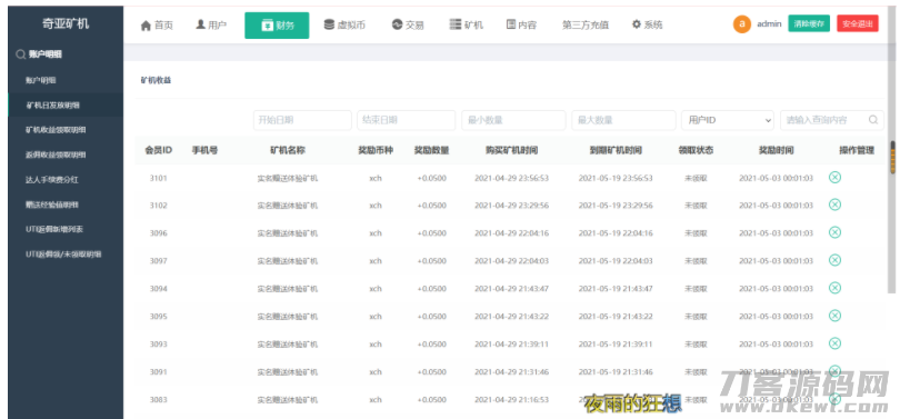 每日按分币分配规则计算、币发放、与币明细数据记录。用户、时间、总数、矿机产出发放、往日线性发放数、分币分配数