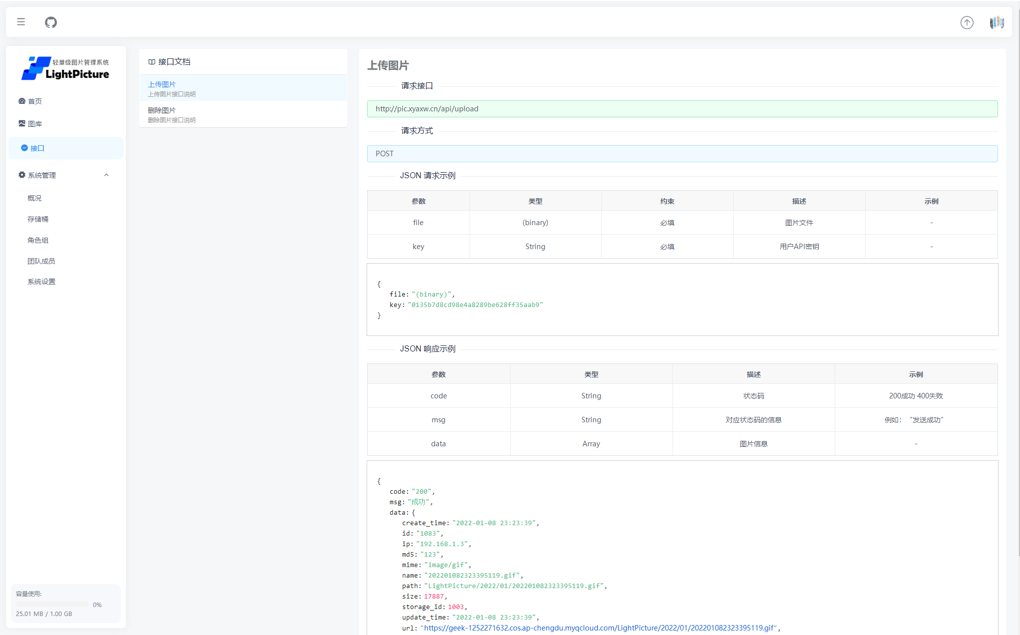 LightPicture - 开源图床系统 高性能、精致、扁平化、多样化储存式的企业化免费图床程序,LightPicture图床系统支持第三方云储存,本地、阿里云 OSS、腾讯云 COS、七牛云 支持多桶储存,可同时添加多个对象存储桶管理 多图上传、拖拽上传、粘贴上传、上传预览、全屏预览、一键复制图片外链 多用户管理、分组管理;不同分组用户控制不同的存储桶 完整的权限控制功能,不同用户组可分配不同的操作权限,控制其上传删除及查看 完整的可视化日志功能,记录用户所有操作,方便事件溯源 全局配置用户初始剩余储存空间、设置指定用户剩余储存空间 支持接口上传、接口删除 原创Geek扁平化页面风格,简约大气;前端使用vue开发,前后端分离