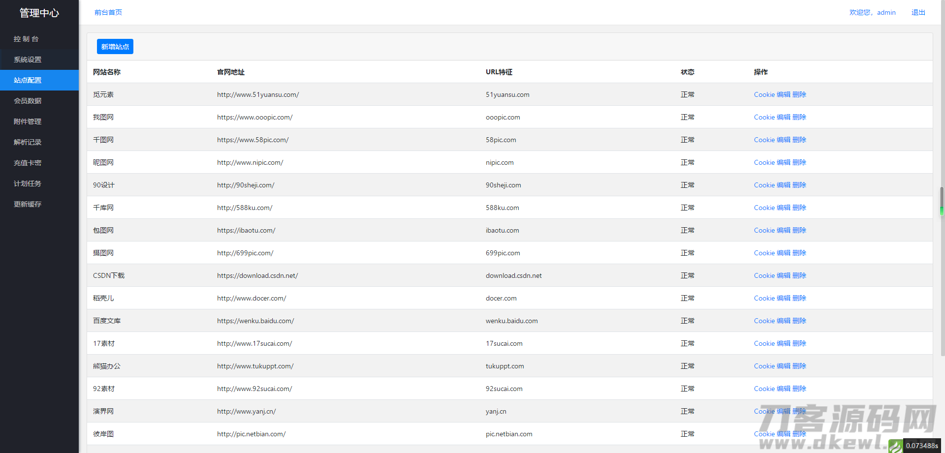 ThinkPHP内核素材解析源码 支持20多家素材站,内附详细安装教程网站运行目录public,最低php5.62019-05-13 更新日志:新增批量添加会员新增卡密充值功能新增代理功能重构解析系统重做前后台UI界面新增缓存处理优化会员系统2019-04-01 更新日志:新增用户过期时间功能,过期后的用户无法使用网站解析功能新增 图品汇 素材资源站解析规则新增 觅知网 素材资源站解析规则新增 六...