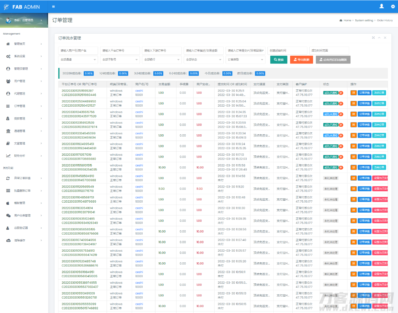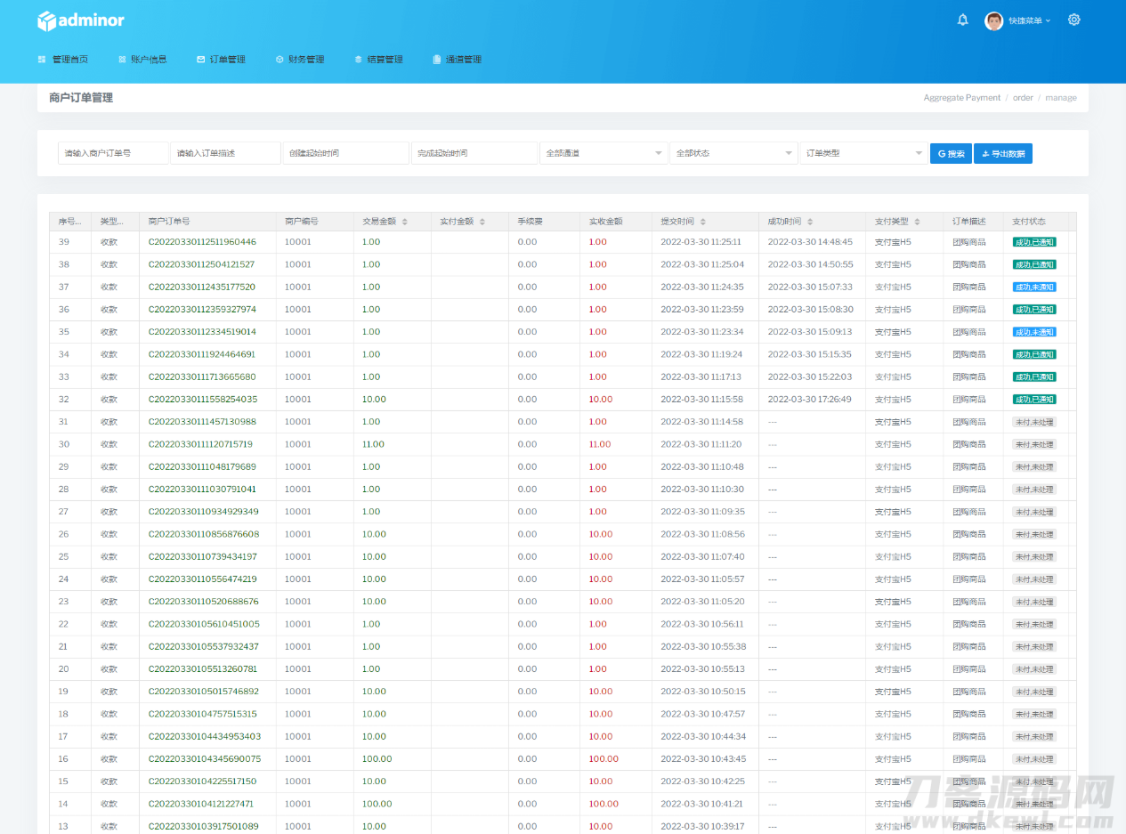 【帐号类型】系统后台多类型管理员、商户代理、普通商户、接口用户;对用的板块后台都不一样相关的数据统计齐全有效。