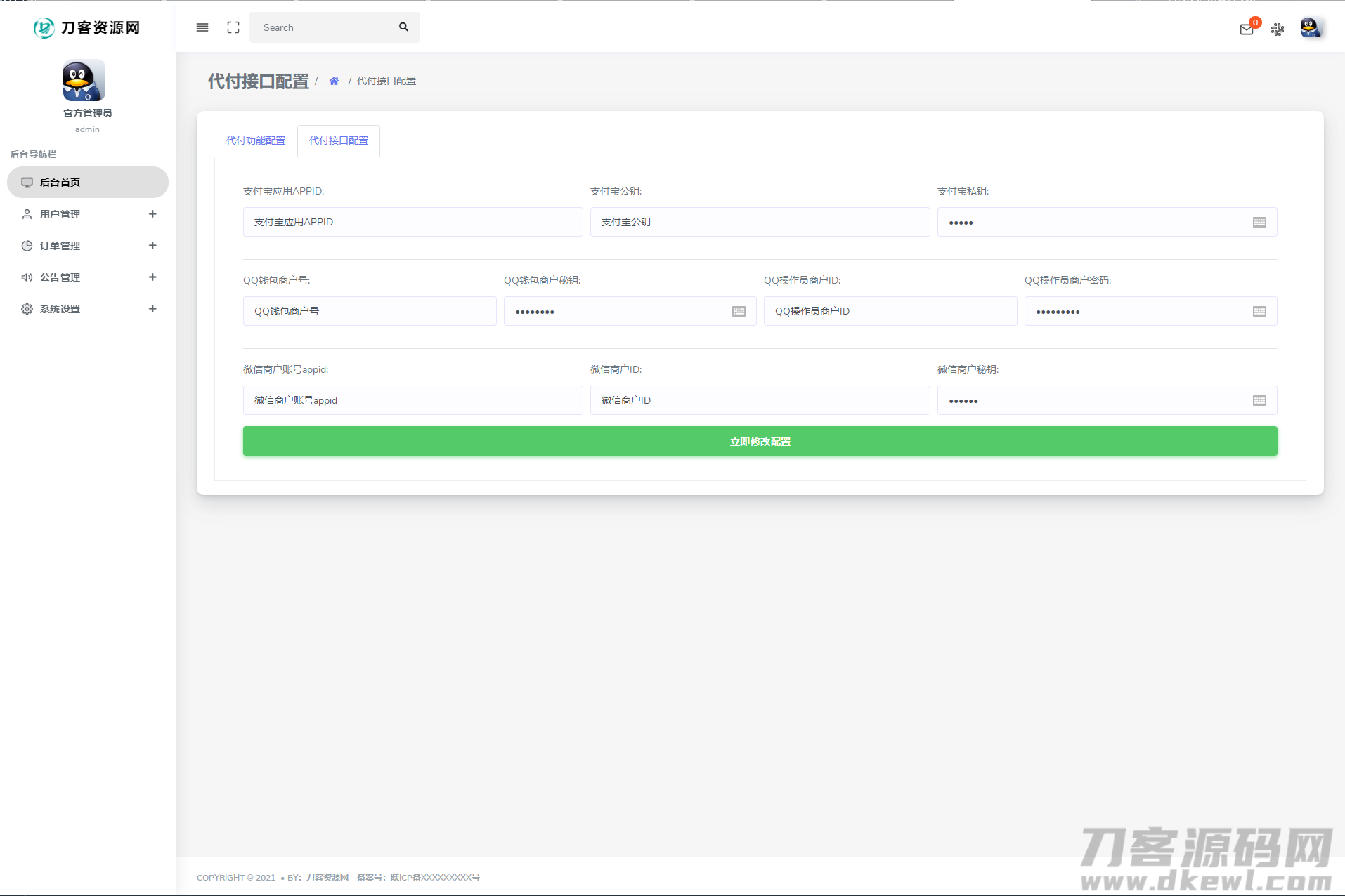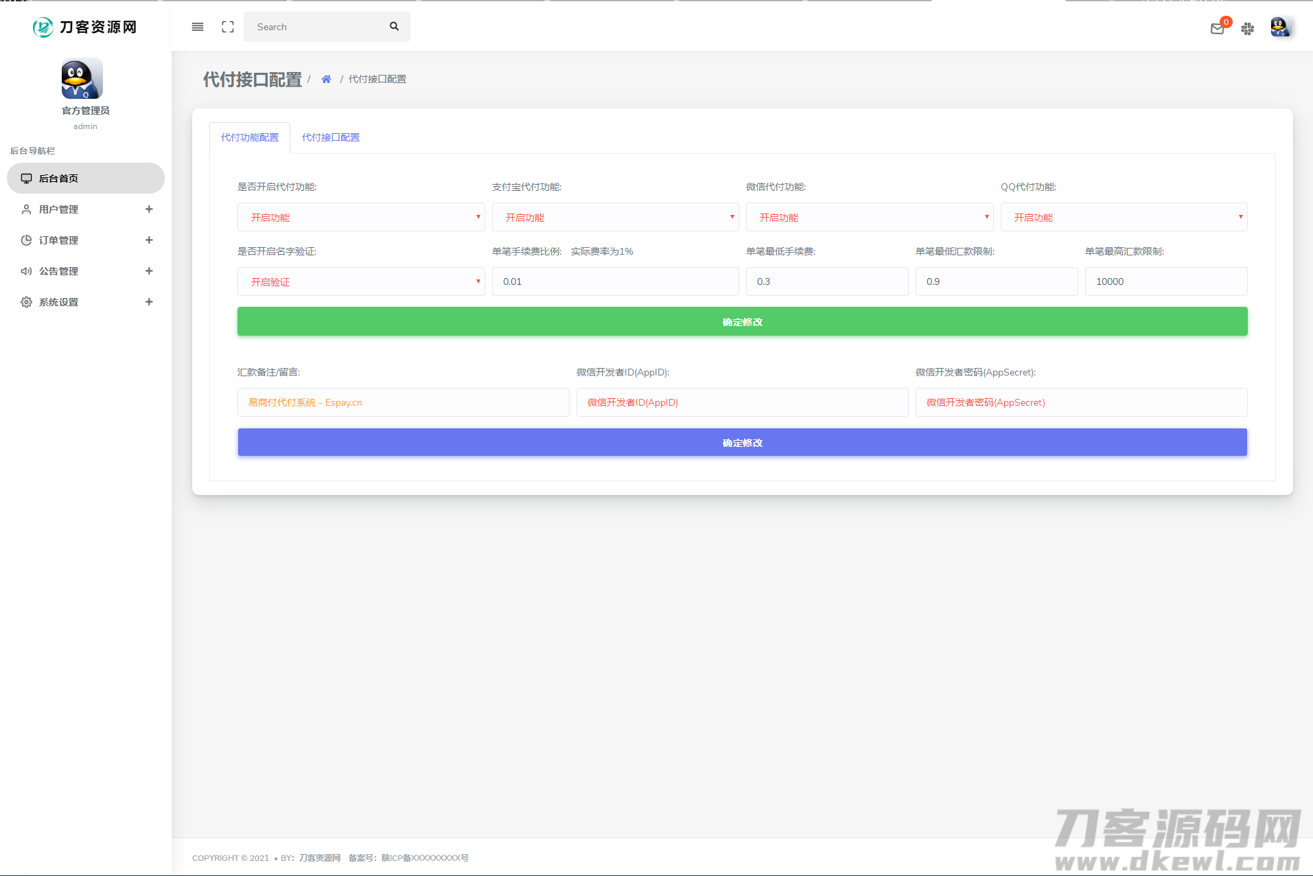 简介:这套代付系统简单易懂,对接了微信支付宝QQ的和第三方API代付,也可以自己对接其他平台,再也不用害怕接口被和谐了,很不错的一套代付源码功能介绍如下:1、支持支付宝、微信、QQ三网代付接口 2、可开启汇款3、可自定义切换手续费承担方 4、充值订单投诉,禁封汇款功能5、自定义设置最低到最 高汇款金额 6、可开启充值金额延迟到账有效保证商户诈骗7、可开启充值金额延迟到账有效保证商户诈骗 8...