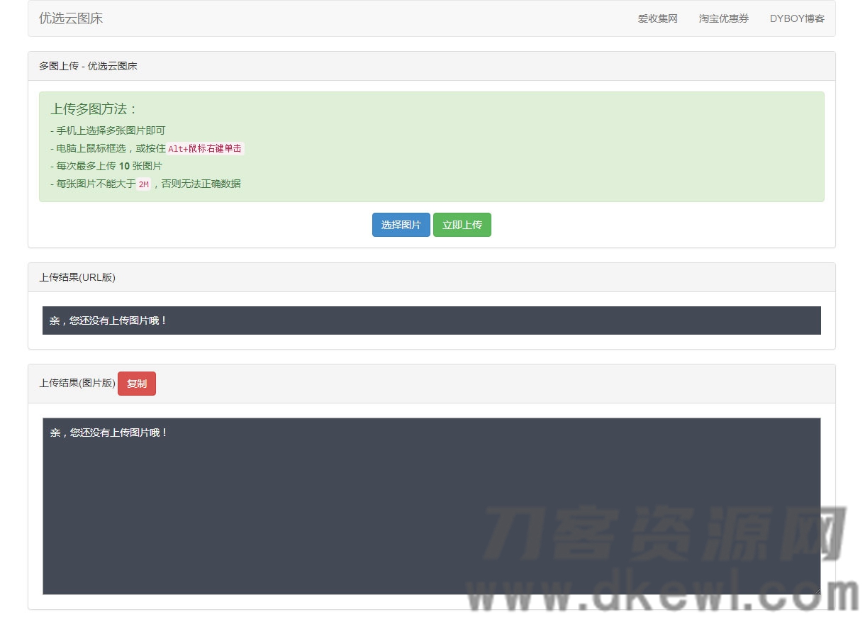 PHP优选云图床源码 聚合图床网源码,这款图床支持超链接模式、html文本模式以及多图批量上传!使用方法:1. 下载压缩包,解压得到CloudPicture文件夹2. 上传文件夹到网站根目录3. 访问:http://域名/CloudPicture/ 就能正常使用这款本地云图床啦!4. 需要修改什么的,直接修改index.html文件中的文字内容即可