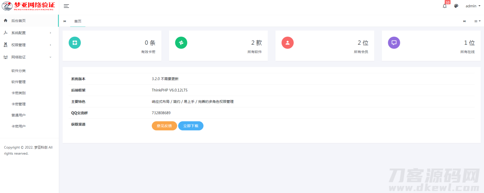 简介:梦亚网络验证,基于thinkphp6.0+Bootstrap开发而成!后台管理系统是梦亚开发而成!网络验证功能也是梦亚开发而成!全量开源! 图片: