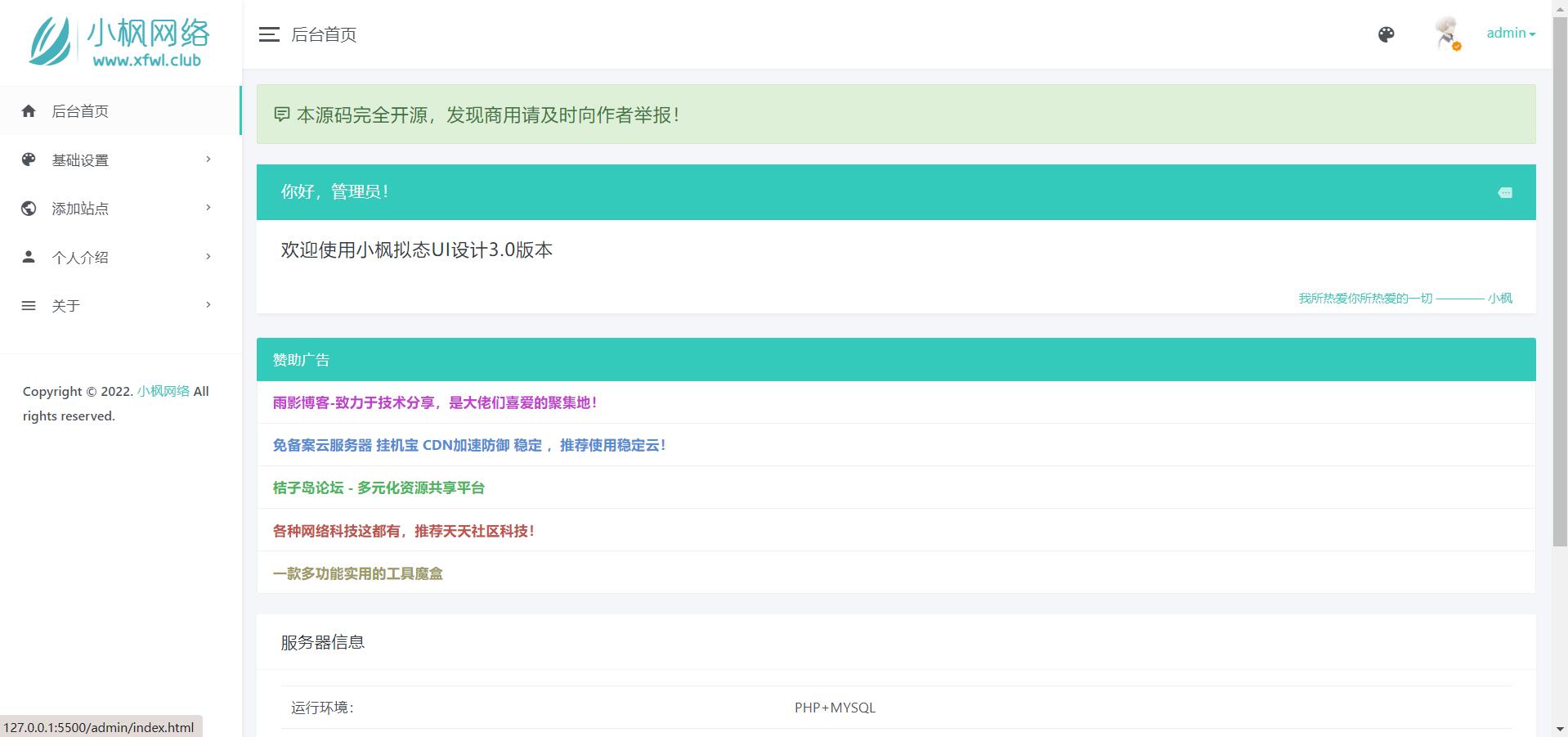 简介:拟态UI3.0-拟态UI设计本源码前端页面以及UI图由小枫开发,后端部分是拿赞助金找人开发的使用说明1.新建域名(设置纯静态),把压缩包导入根目录,(关闭防跨站攻击)2.新建域名 PHP > 7.2 设置域名录 xiaofeng/public (关闭防跨站攻击)3.在路径 xiaofeng/.env 配置数据库信息4.在路径 admin/js/common.js 部署前端接口 (http:/...