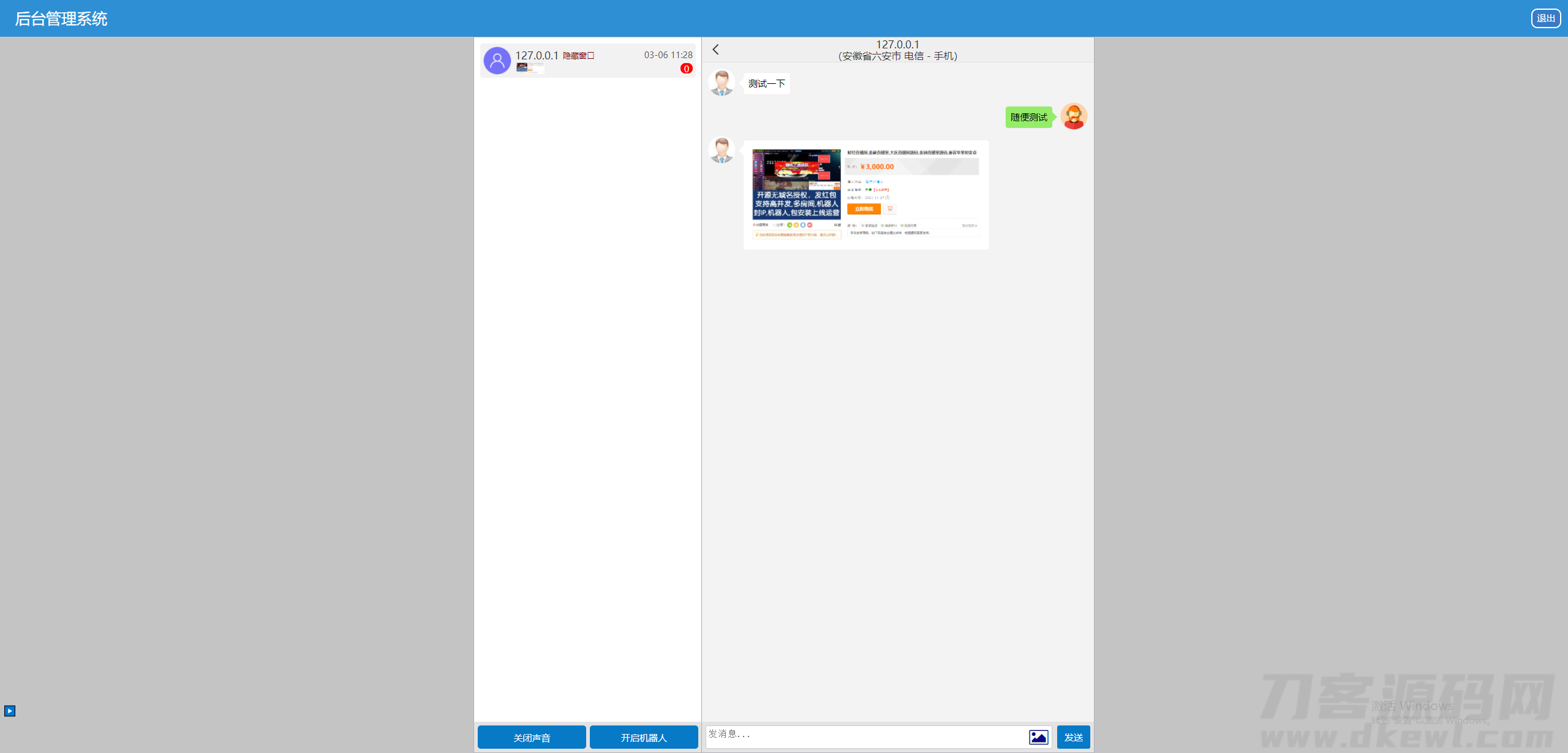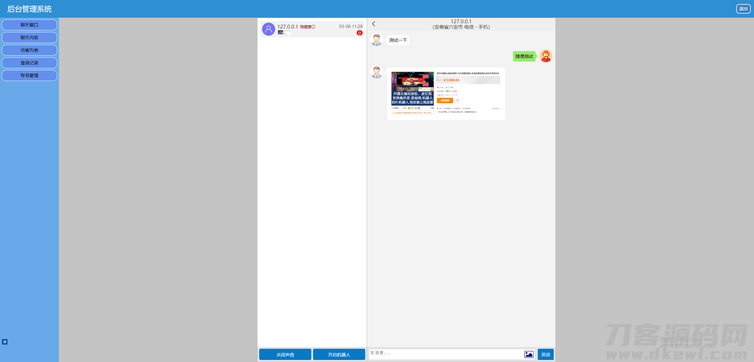 2,后台会话窗口增加了显示会话者IP对应地址及运营商(使用第三方接口,如第三方接口出问题,免费更换接口,但不得以此理由退款)