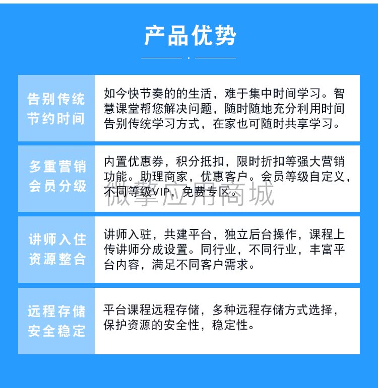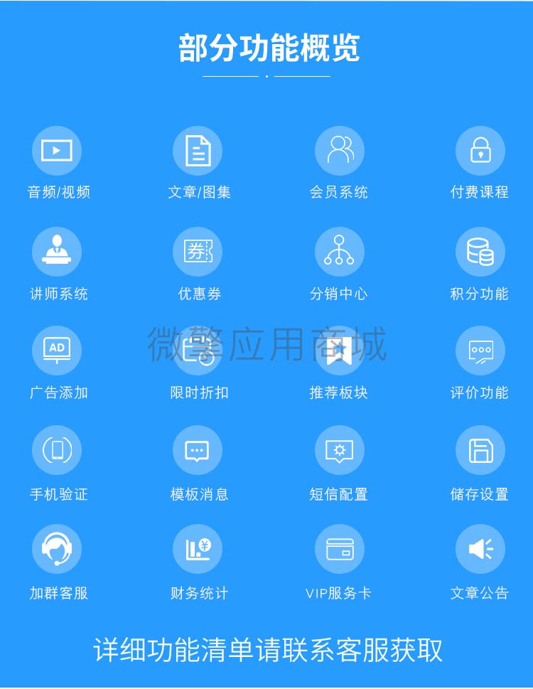 简介:微课堂V2-4.1.1 、仅公众号、专业的知识付费系统,官方去授权,最新版本更新了:优化阿里云播放器播放视频时,播放器右下角清晰度、倍速等遮住进度条问题。测试环境:系统环境:CentOS Linux 7.6.1810 (Core)运行环境:宝塔 Linux v7.0.3(专业版)网站环境:Nginx 1.15.10 + MySQL 5.6.46 + PHP-7.1 / PHP-5.6常见插件...