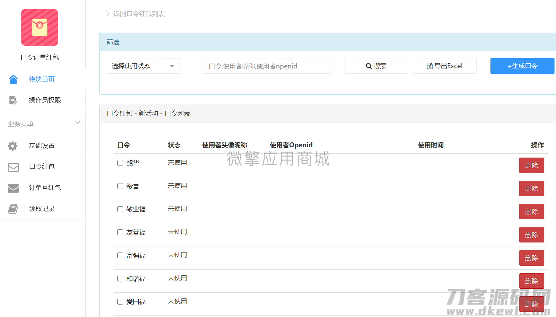 后台生成口令(纯数字,纯字母,数字与字母,上传自定义中英文口令)或上传订单号