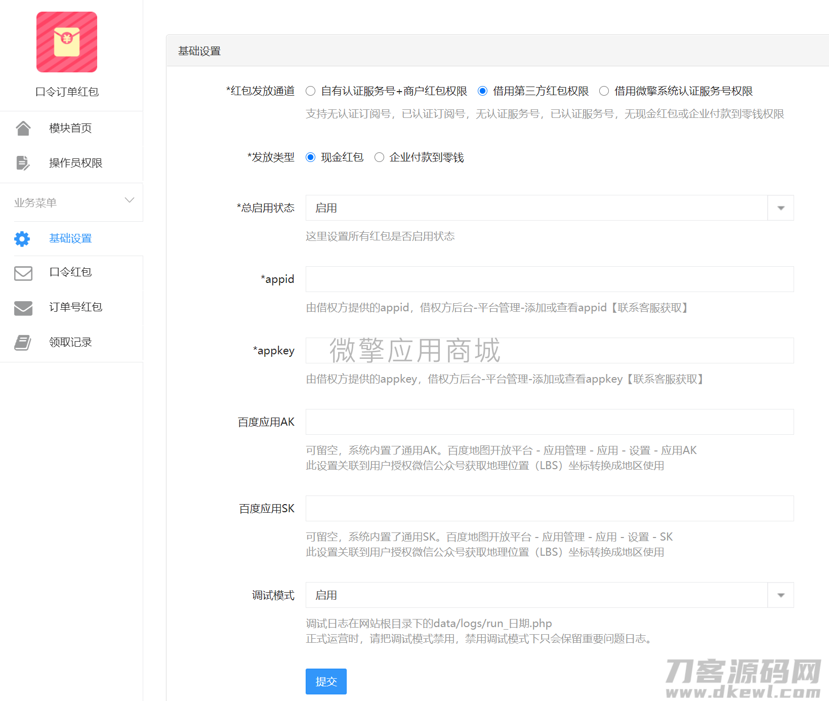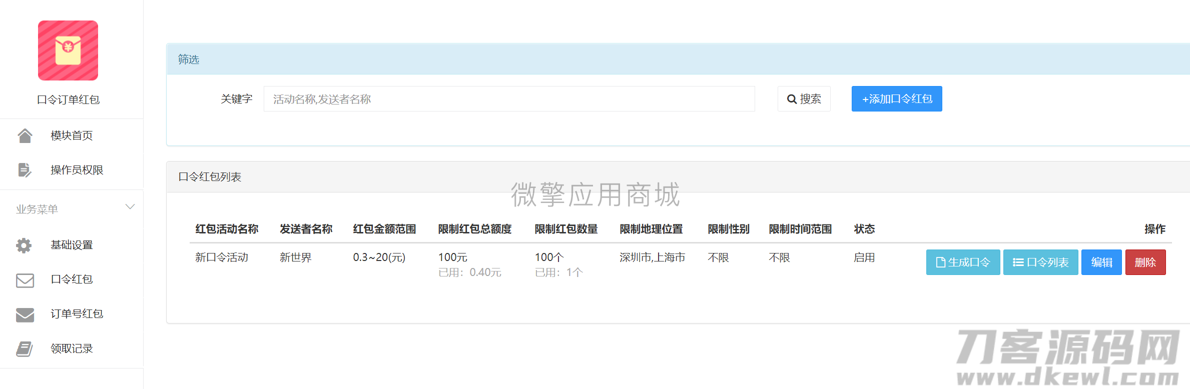 简介:口令订单红包是一款为微信公众号口令红包查看更多关于 口令红包 的文章应用程序,主要应用场景:后台生成口令(纯数字,纯字母,数字与字母,上传自定义中英文口令)或上传订单号,用户打开微信公众号查看更多关于 微信公众号 的文章,输入口令/订单号,条件正确后,自动发放红包或企业付款到零钱。使用此应用的必要条件:一:已开通的微信公众号查看更多关于 微信公众号 的文章(支持订阅号借权与认证服务号)二:已...