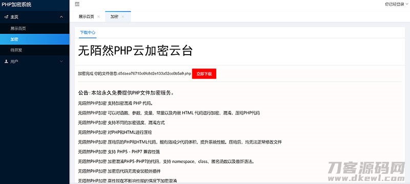 使用本加密,用户需要注册登录之后才能使用本加密,登录之后用户可自行上传php文件进行加密,加密成功之后即可下载,