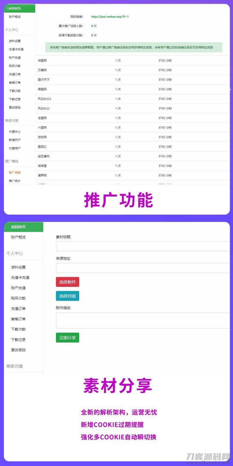 V8版本。十月一日最 新更新,全新的解析架构。小白问题一:为什么我不能解析?答:解析是需要开通目标站VIP的。小白问题二:竟然要开通VIP,要你这源码干嘛?有毛病。【这个问题真的有人问过,我也是醉了】答:素材解析是您开通一个VIP然后开会员卖给别人共享解析,就相当于你开了一个会员给了N个人用,收他们的钱。如果这些素材站真的能免费解析,那么他们就喝西北风了。退款专用理由:源码有BUG或者素材不能解析...