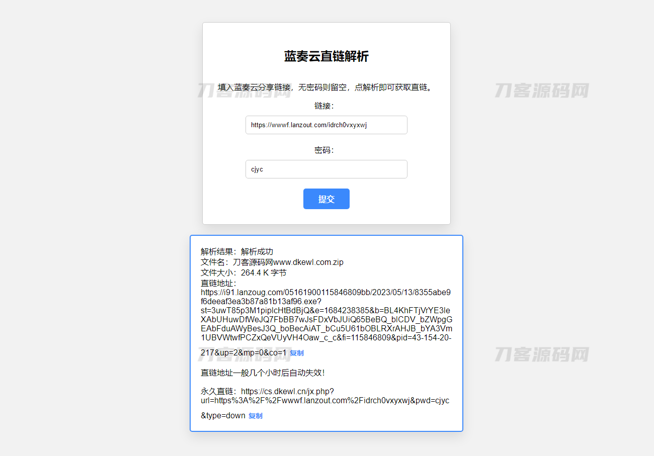 简介:蓝奏云直链获取在线解析网站源码 蓝奏云链接解析 本地API接口 支持有无密码和短期直链和永久直链,同时还可以显示文件名和大小。这个解析器无需数据库即可搭建,API接口已经本地化,非常简单易用。图片: