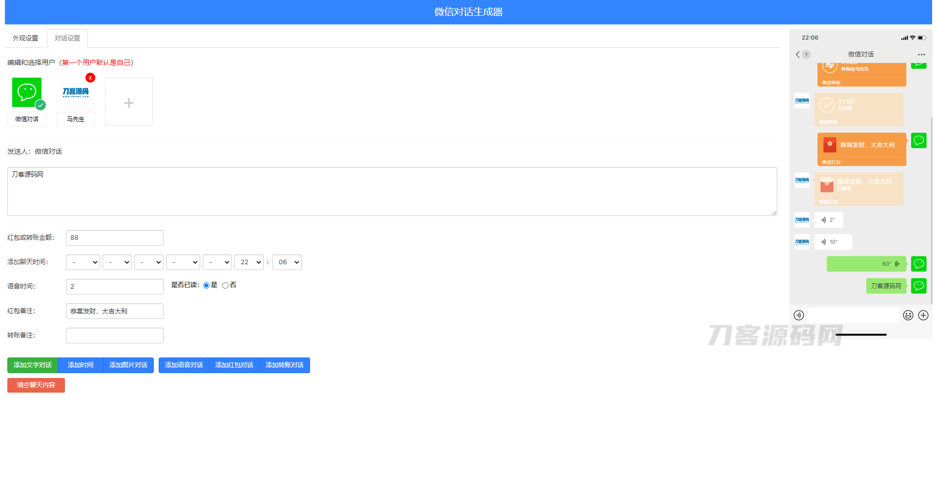 简介:在线微信对话生成器源码,抖音微信聊天搞笑视频制作神器微信对话生成器,是一款在线微信聊天对话制作的工具,它可以设置苹果或安卓状态栏,包括手机电量、手机时间等,还可以设置不同用户的角色,然后发送文字、语音、等多种好玩的功能,可谓是一款娱乐制作神器。 图片: