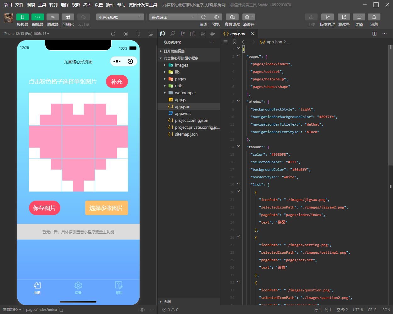 简介:九宫格心形拼图小程序源码,带流量主微信小程序源码。可以自定义拼图形状,保存张数自由填充图片、自由剪裁图片等。并带有流量主广告位,有需要的可以下载看看。 图片: