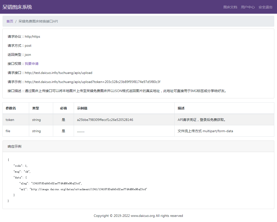 通过API上传接口可以将本地图片上传至呆错免费图床并以JSON格式返回图片的真实地址。
